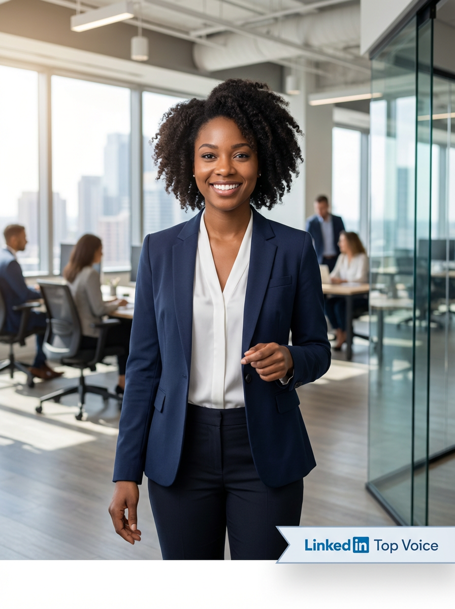 wide LinkedIn profile photo of a professional business model as a confident professional business model standing in a modern office. LinkedIn professional profile photo. most popular person on LinkedIn