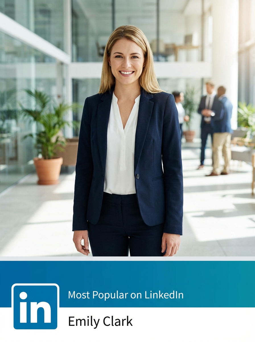 wide LinkedIn profile photo of a professional business model as a confident professional business model standing in a modern office. LinkedIn professional profile photo. most popular person on LinkedIn