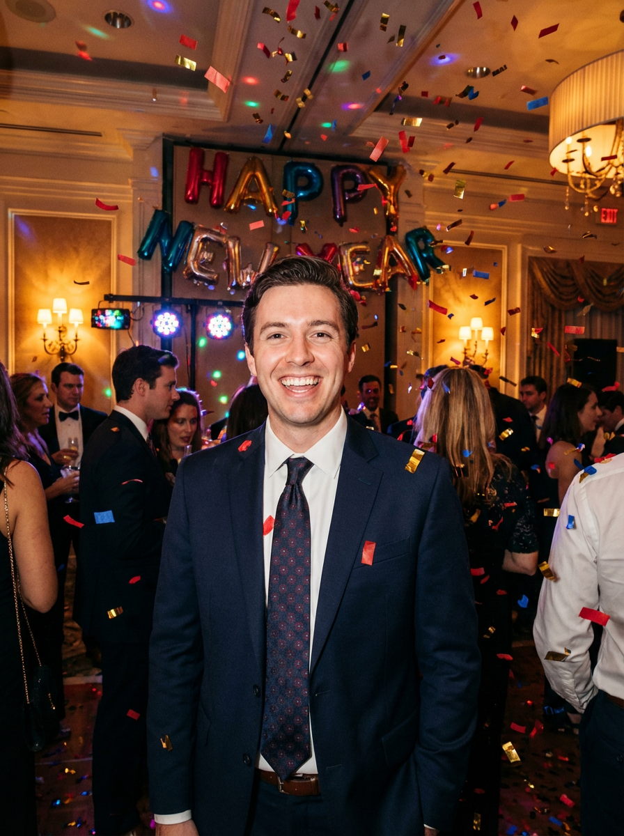 Wide shot of smiling model standing amidst a cascade of confetti. The model wears a stylish navy suit with a festive tie. The scene features a decorated ballroom with 'Happy New Year' balloons. Soft glowing lighting.