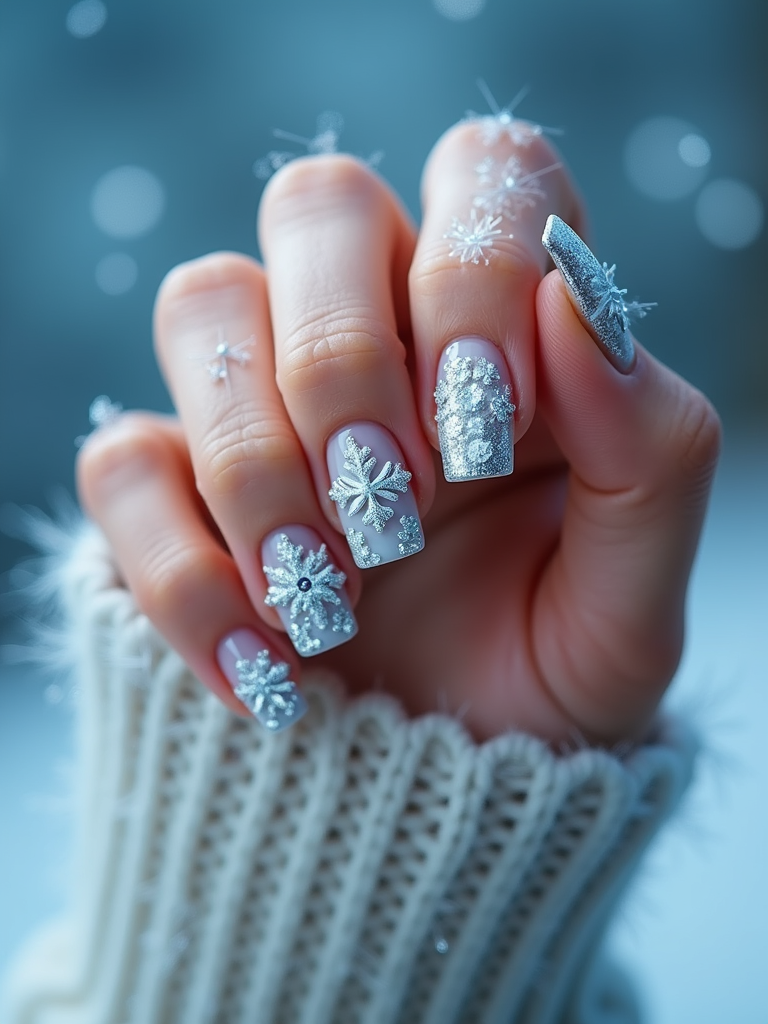 winter wonderland nails with 3D snowflakes and silver glitter, icy blue background, elegant hand posture, dramatic lighting setup