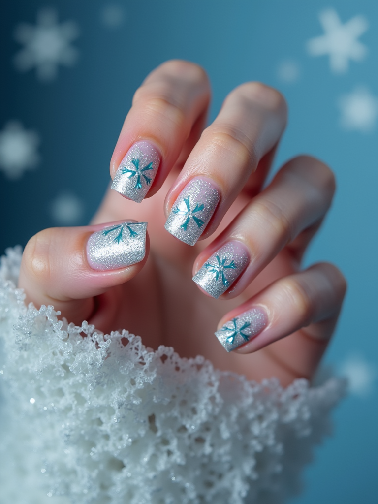 winter wonderland nails with 3D snowflakes and silver glitter, icy blue background, elegant hand posture, dramatic lighting setup