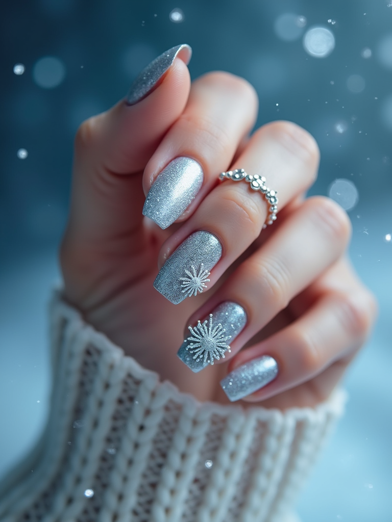 winter wonderland nails with 3D snowflakes and silver glitter, icy blue background, elegant hand posture, dramatic lighting setup