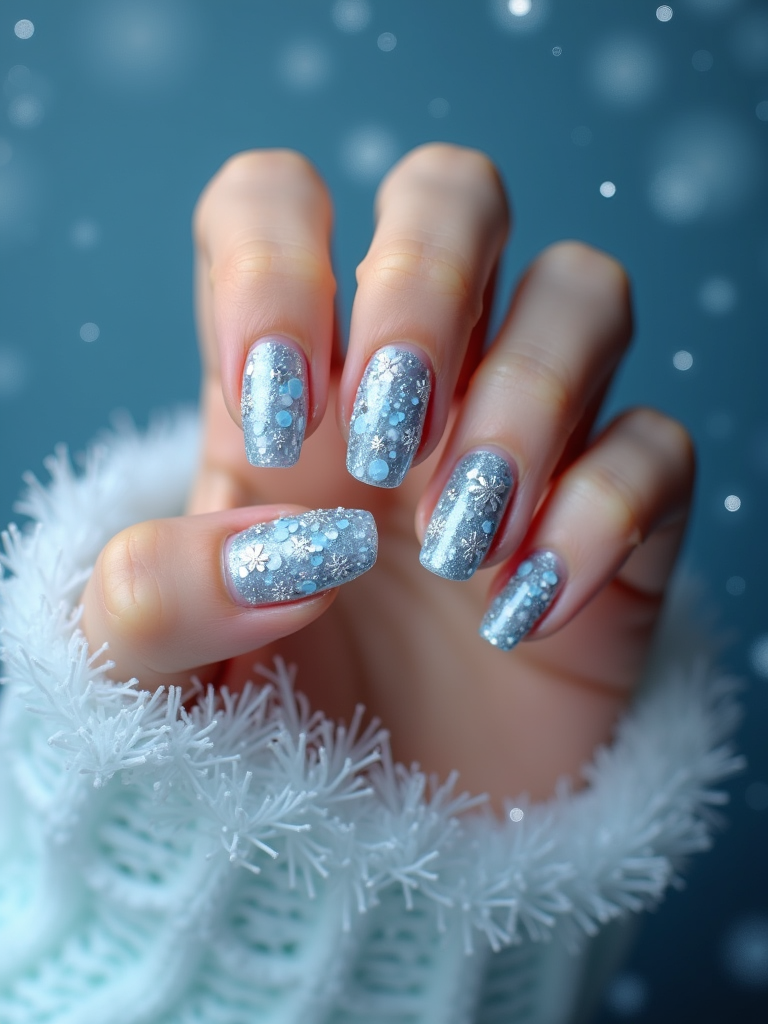 winter wonderland nails with 3D snowflakes and silver glitter, icy blue background, elegant hand posture, dramatic lighting setup