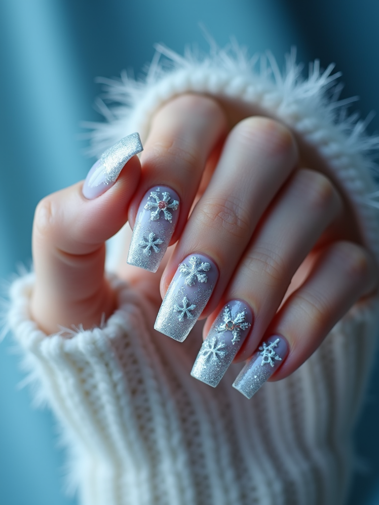 winter wonderland nails with 3D snowflakes and silver glitter, icy blue background, elegant hand posture, dramatic lighting setup