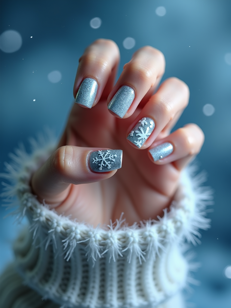 winter wonderland nails with 3D snowflakes and silver glitter, icy blue background, elegant hand posture, dramatic lighting setup