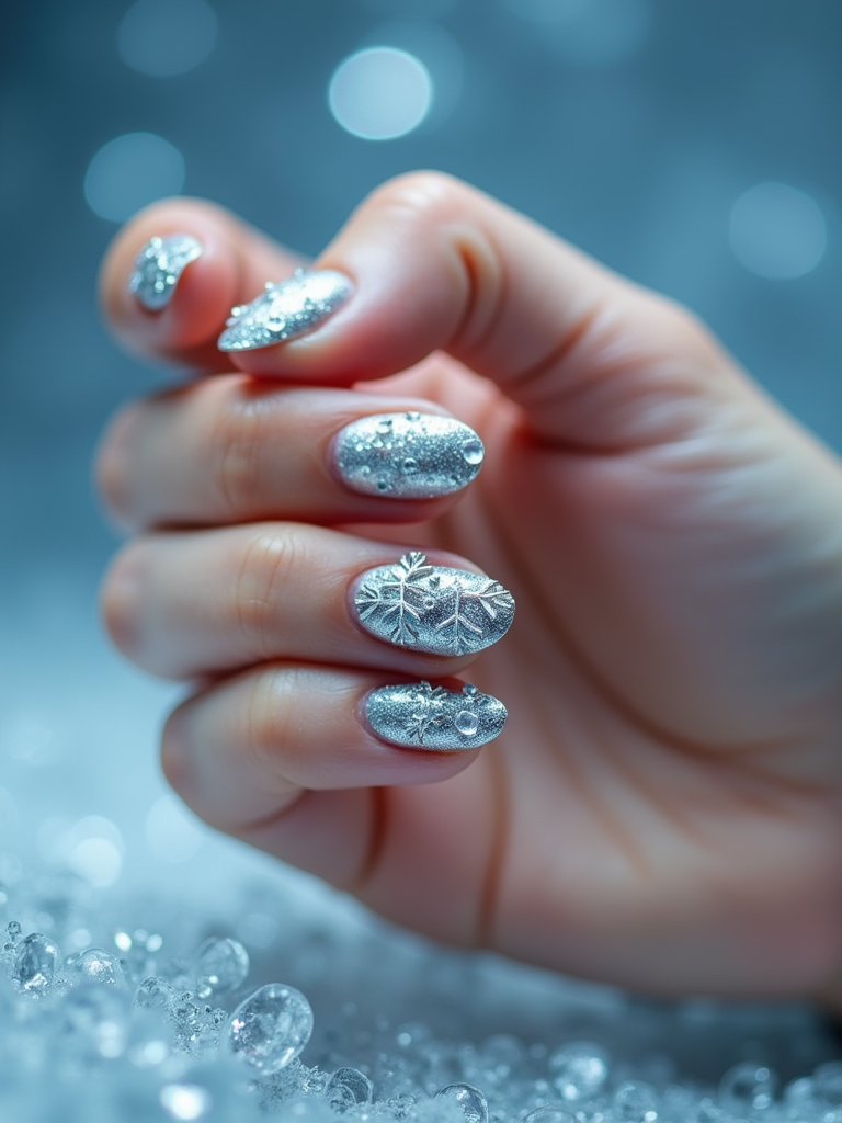 winter wonderland nails with 3D snowflakes and silver glitter, icy blue background, elegant hand posture, dramatic lighting setup