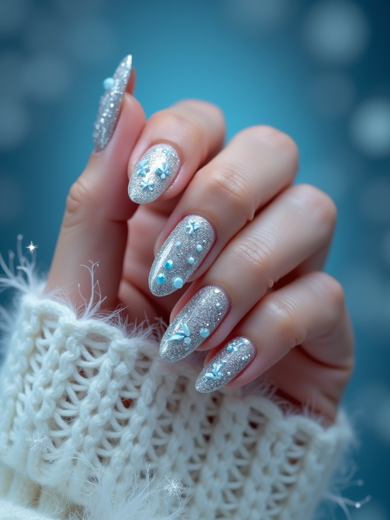 winter wonderland nails with 3D snowflakes and silver glitter, icy blue background, elegant hand posture, dramatic lighting setup