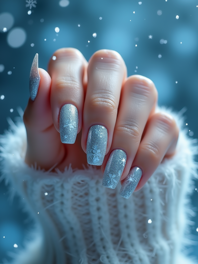 winter wonderland nails with 3D snowflakes and silver glitter, icy blue background, elegant hand posture, dramatic lighting setup