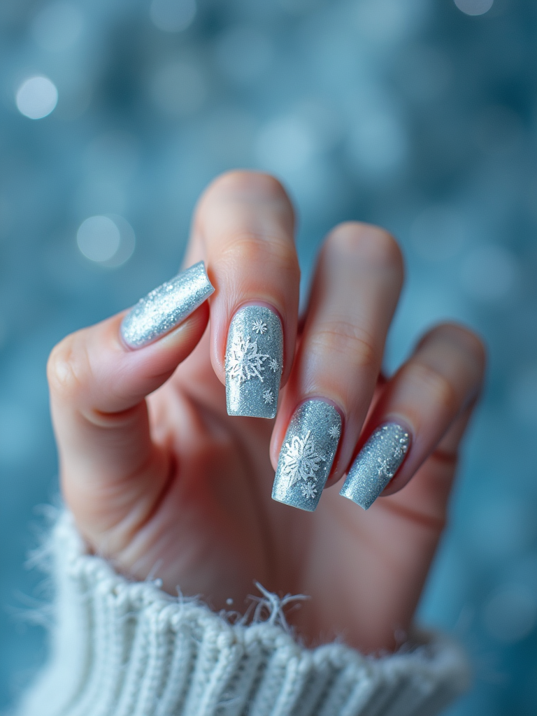 winter wonderland nails with 3D snowflakes and silver glitter, icy blue background, elegant hand posture, dramatic lighting setup
