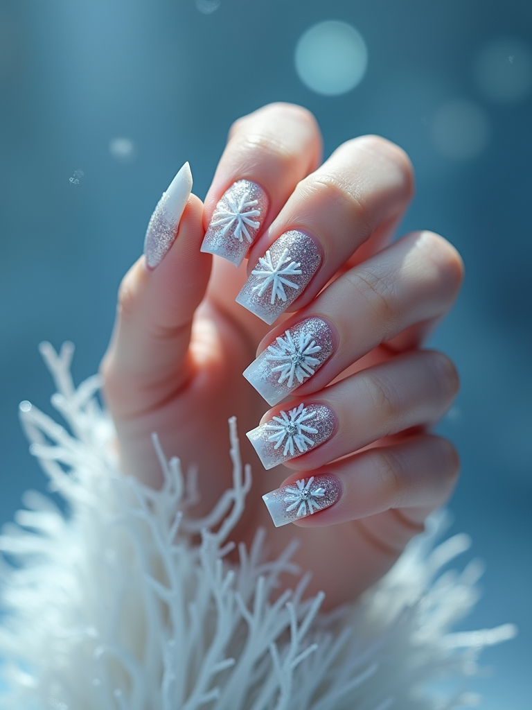 winter wonderland nails with 3D snowflakes and silver glitter, icy blue background, elegant hand posture, dramatic lighting setup