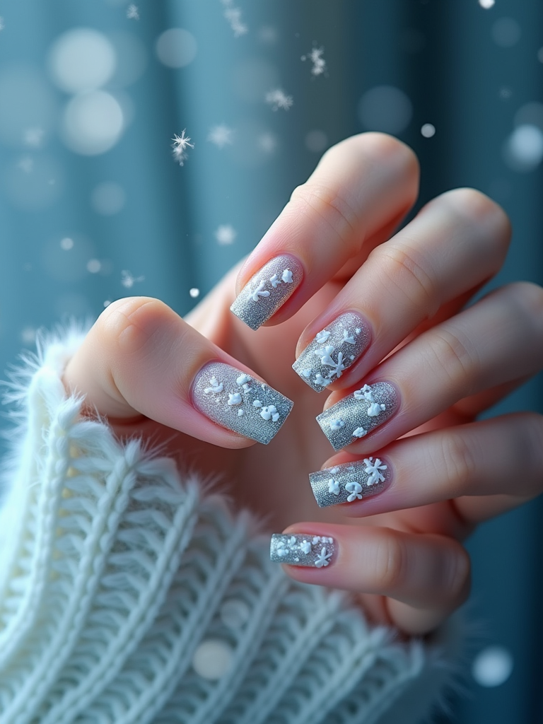 winter wonderland nails with 3D snowflakes and silver glitter, icy blue background, elegant hand posture, dramatic lighting setup