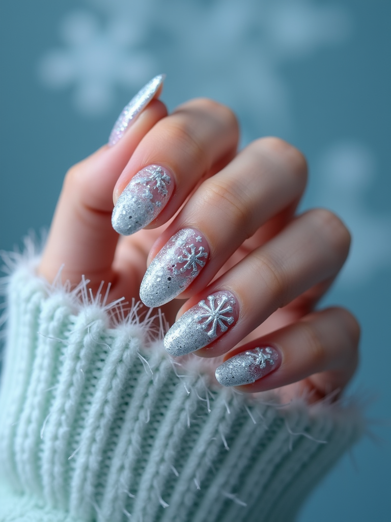 winter wonderland nails with 3D snowflakes and silver glitter, icy blue background, elegant hand posture, dramatic lighting setup