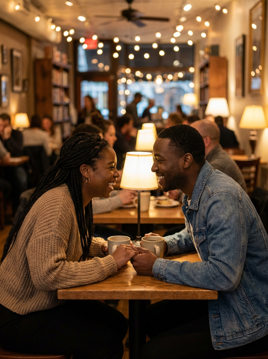 model and attractive boyfriend sharing coffee at cozy cafe, intimate conversation, warm indoor lighting, casual stylish outfits