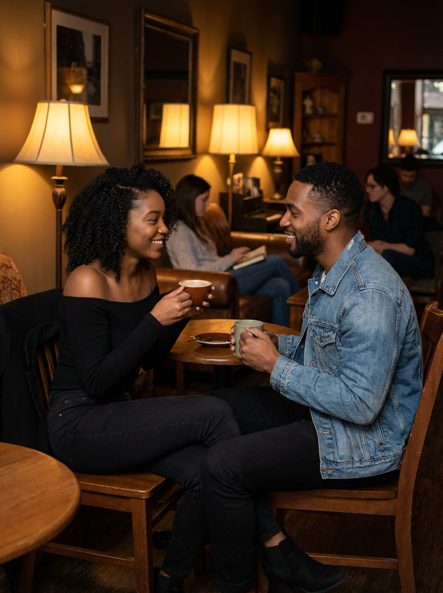 model and attractive boyfriend sharing coffee at cozy cafe, intimate conversation, warm indoor lighting, casual stylish outfits