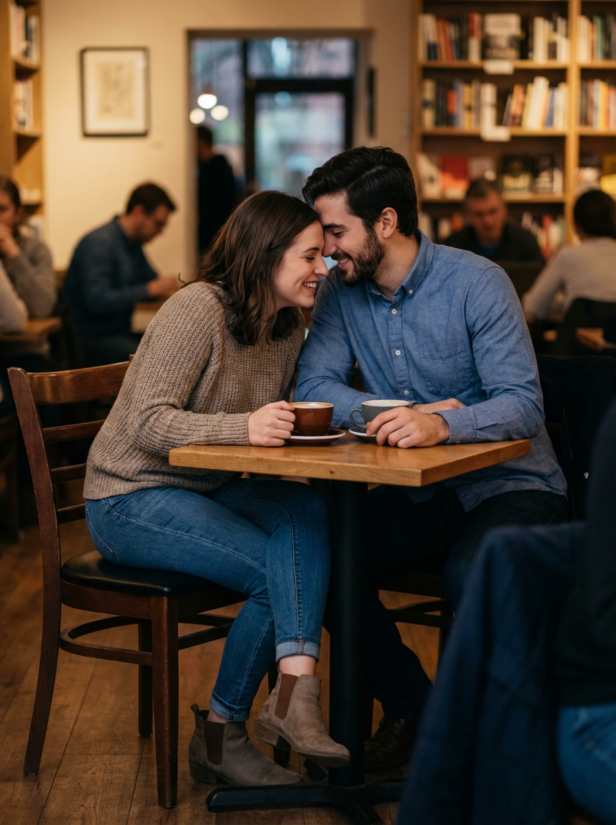 model and attractive boyfriend sharing coffee at cozy cafe, intimate conversation, warm indoor lighting, casual stylish outfits