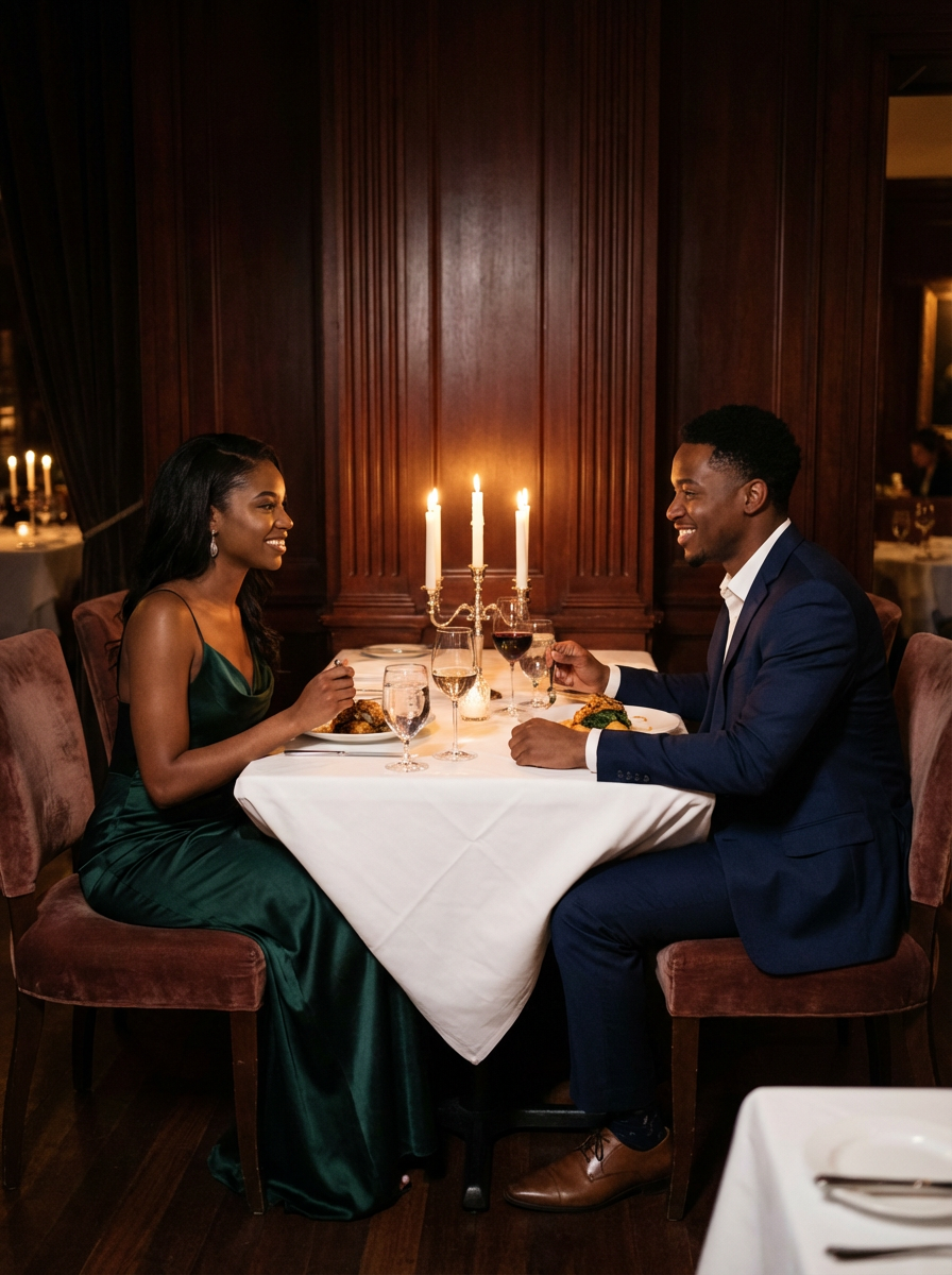 model and boyfriend at fancy restaurant dinner date, elegant attire, candlelit table, romantic ambiance