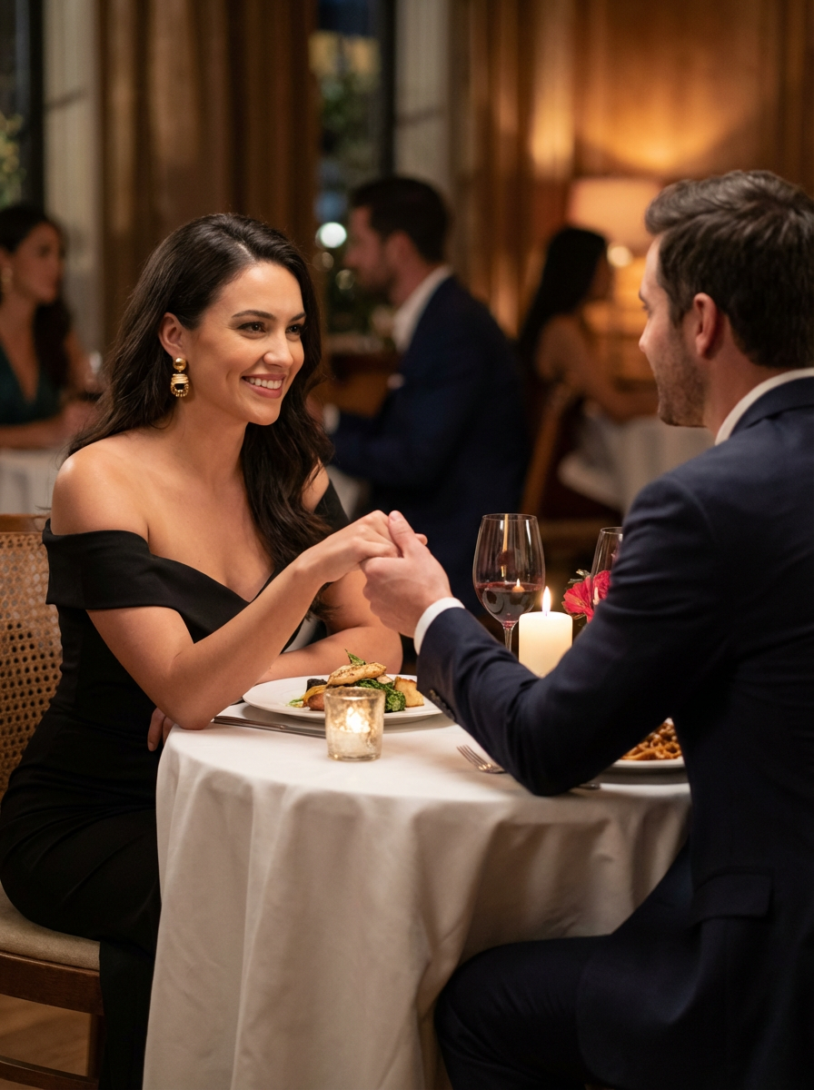 model and boyfriend at fancy restaurant dinner date, elegant attire, candlelit table, romantic ambiance