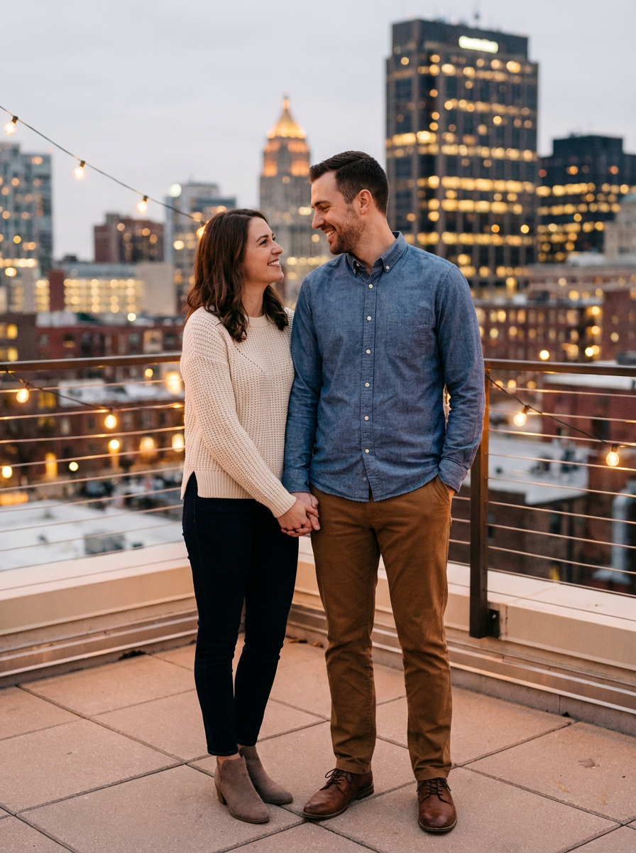 model and boyfriend on rooftop date, city skyline background, evening lights, smart casual outfits, romantic atmosphere