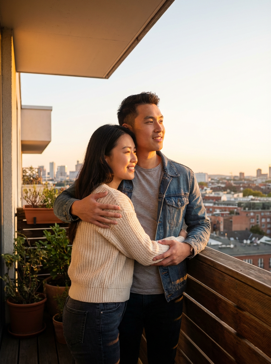 model and boyfriend watching sunset from balcony, embracing, casual comfortable clothes, golden hour lighting