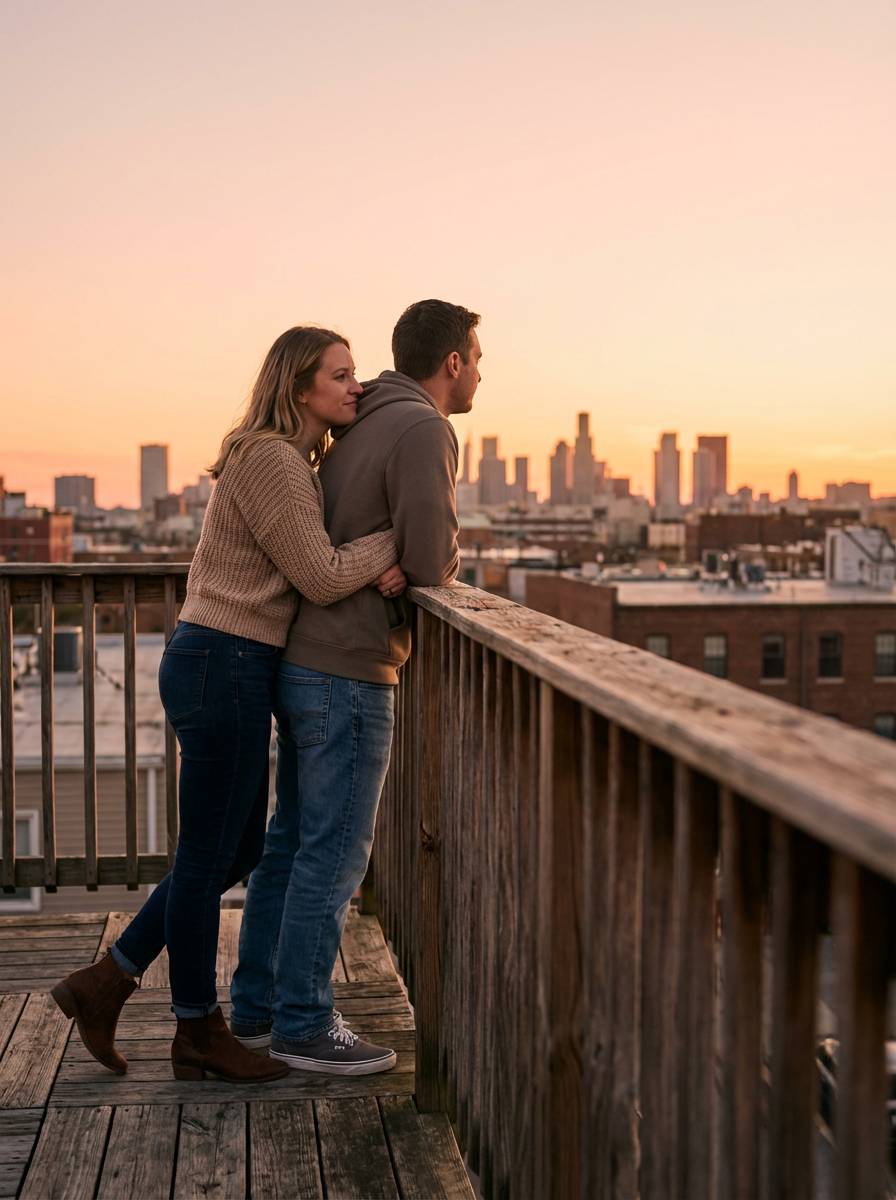model and boyfriend watching sunset from balcony, embracing, casual comfortable clothes, golden hour lighting