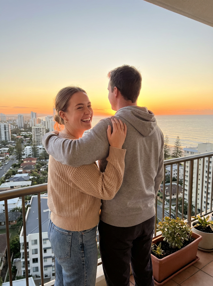 model and boyfriend watching sunset from balcony, embracing, casual comfortable clothes, golden hour lighting