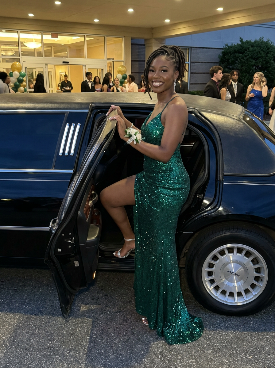 model arriving at prom in style, stunning dress reveal , limousine or nice car visible