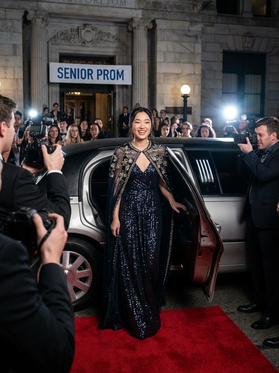 model arriving at prom in style, stunning dress reveal , limousine or nice car visible