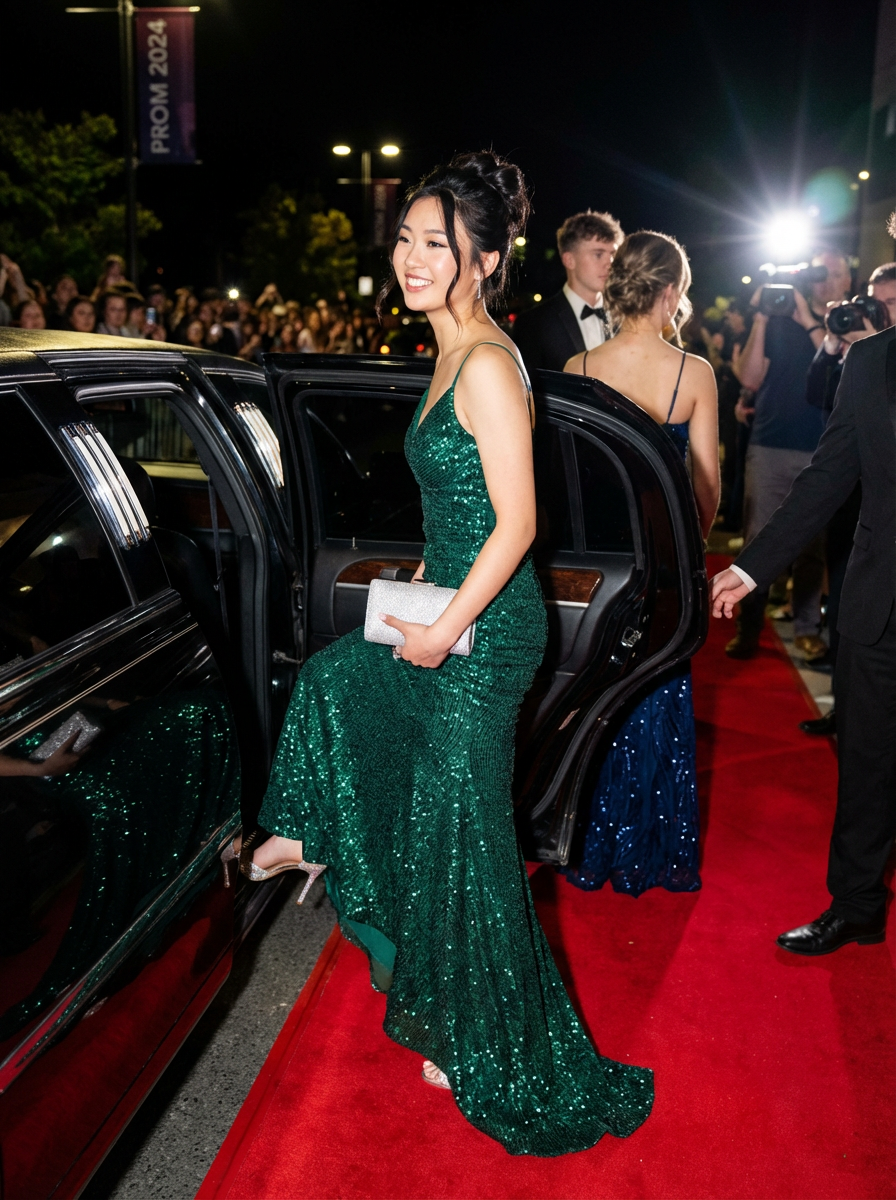 model arriving at prom in style, stunning dress reveal , limousine or nice car visible