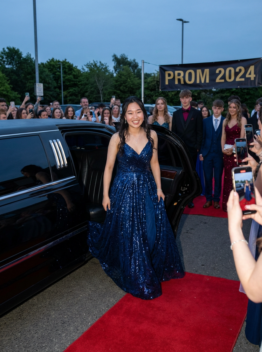 model arriving at prom in style, stunning dress reveal , limousine or nice car visible