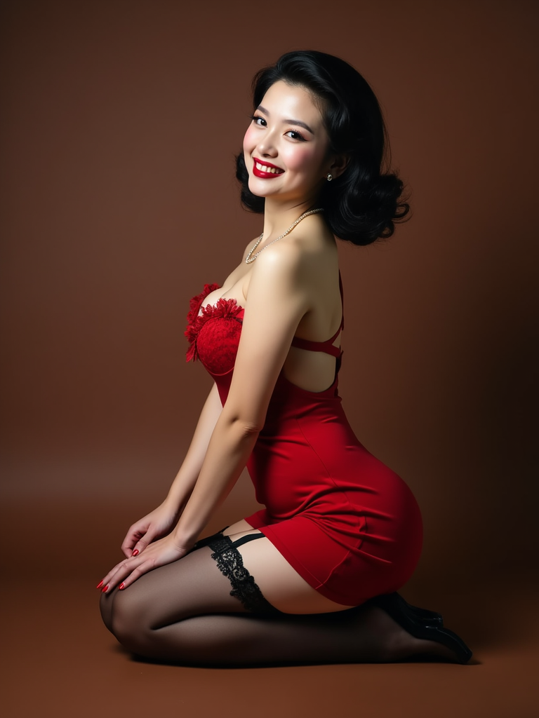 model as a 1950s pin-up girl kneeling, wearing a low-cut red dress with black stockings and garter straps visible, smiling seductively, retro hairstyle and makeup, soft studio lighting