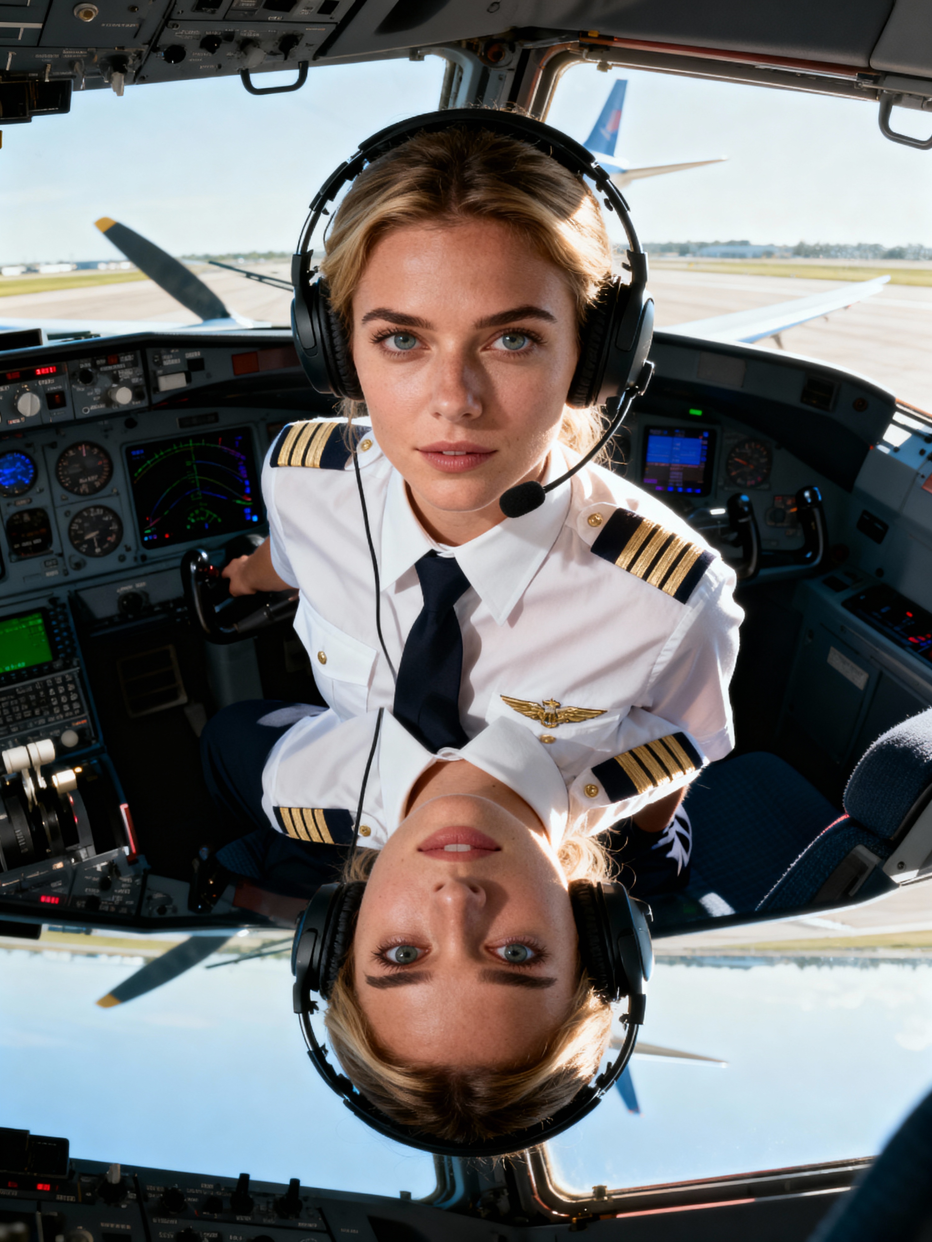 model as a Airline Pilot inside the Cockpit with white shirt Pilot Uniform