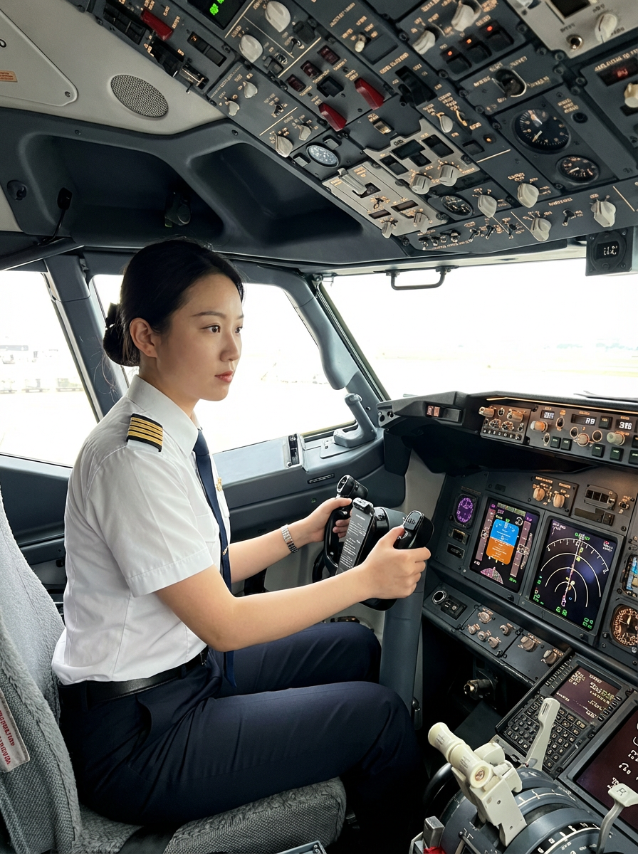 model as a Airline Pilot inside the Cockpit with white shirt Pilot Uniform