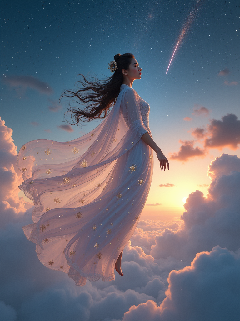 model as a celestial goddess in star-covered flowing robes floating among clouds with constellation patterns and shooting stars in a twilight fantasy sky