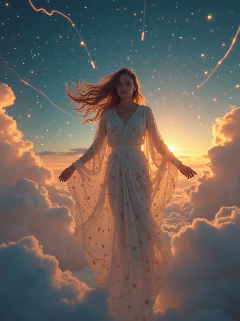 model as a celestial goddess in star-covered flowing robes floating among clouds with constellation patterns and shooting stars in a twilight fantasy sky