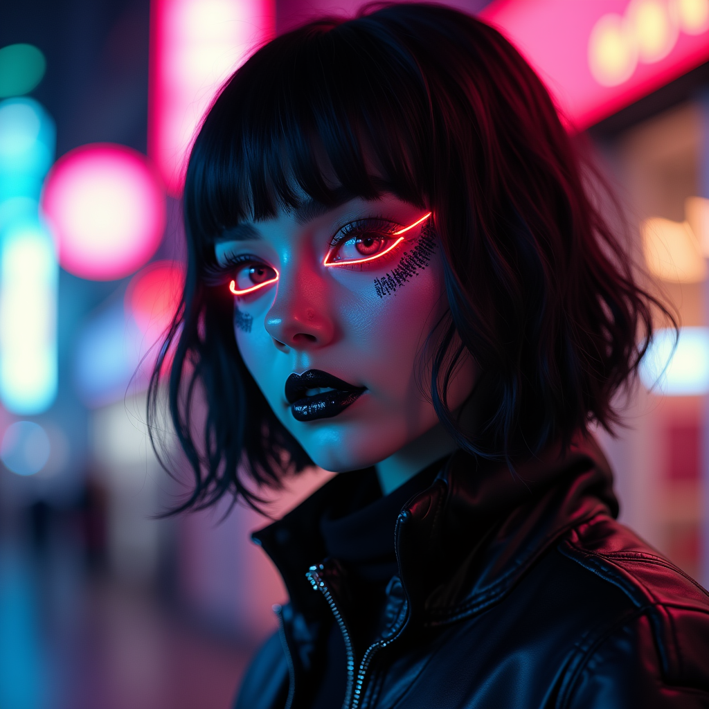 model as a cyberpunk e-girl transformation. dark lipstick, neon eyeliner, futuristic fashion . tokyo street-style lighting.