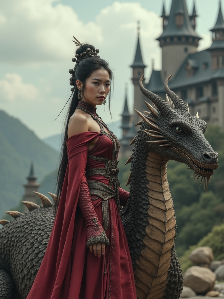 model as a dragon rider princess wearing leather and silk fantasy outfit standing next to a friendly dragon in front of a medieval fantasy castle with dramatic cloudy skies