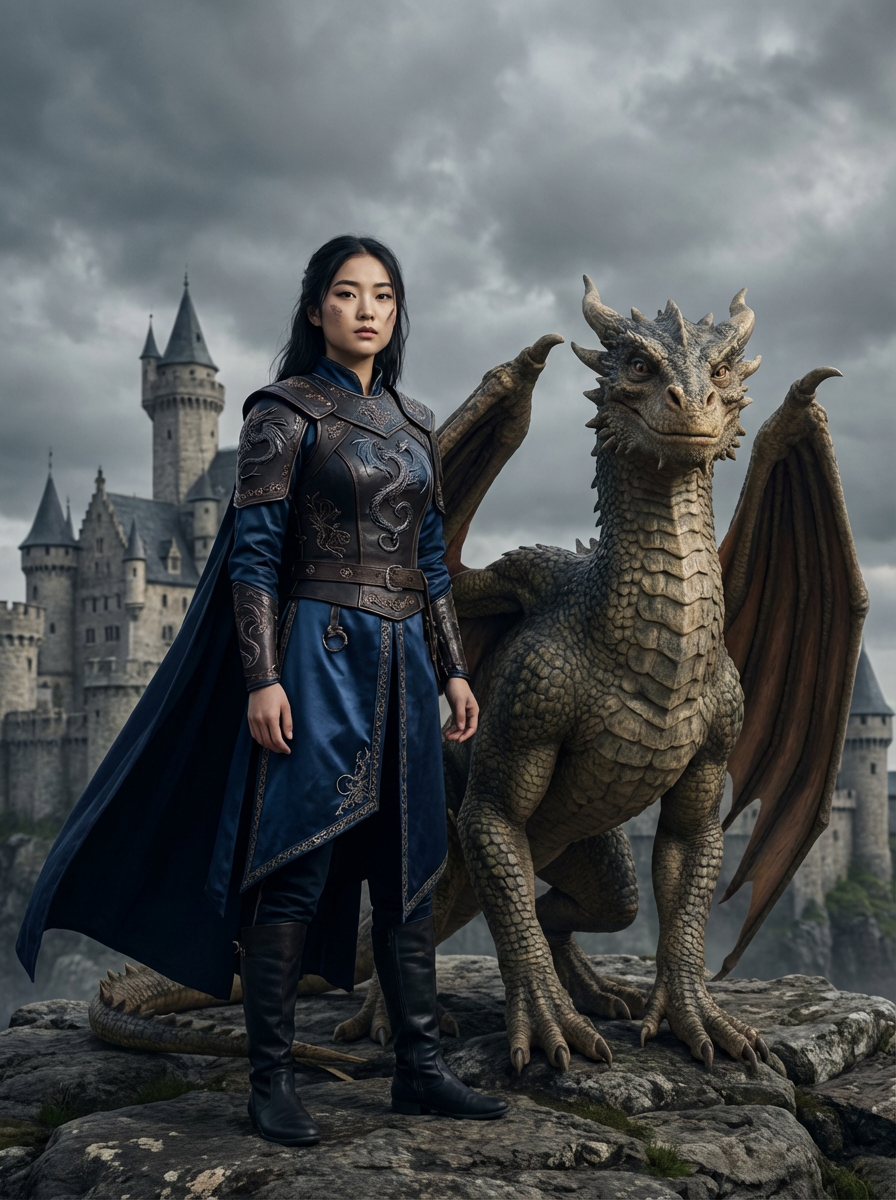 model as a dragon rider princess wearing leather and silk fantasy outfit standing next to a friendly dragon in front of a medieval fantasy castle with dramatic cloudy skies