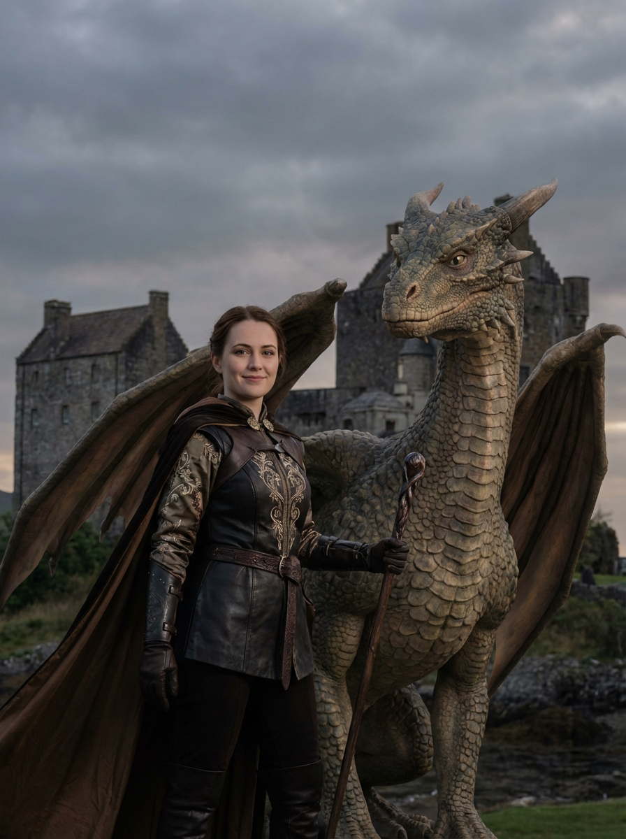 model as a dragon rider princess wearing leather and silk fantasy outfit standing next to a friendly dragon in front of a medieval fantasy castle with dramatic cloudy skies