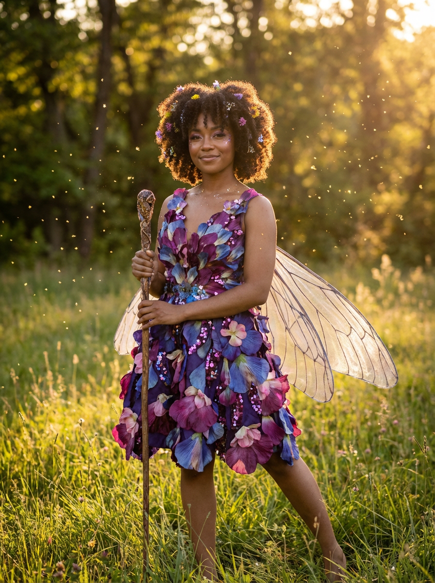 model as a fairy queen with delicate translucent wings wearing a sparkly dress made of flower petals standing in a flower meadow with magical golden hour lighting and floating sparkles