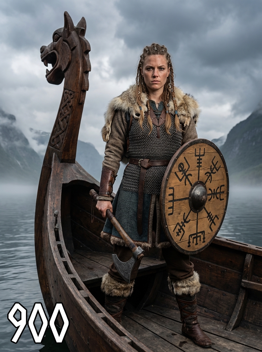 model as a fierce Viking shieldmaiden with intricate braided hair adorned with metal rings and beads, wearing layered wool and leather garments with fur trim, chainmail vest, and leather bracers standing on the deck of a longship with carved dragon head, surrounded by misty fjords and dramatic Nordic landscape under stormy skies, holding traditional weapons and wooden shield with Norse symbols, text overlay in bottom corner reading "900" in white sans serif font with black outline