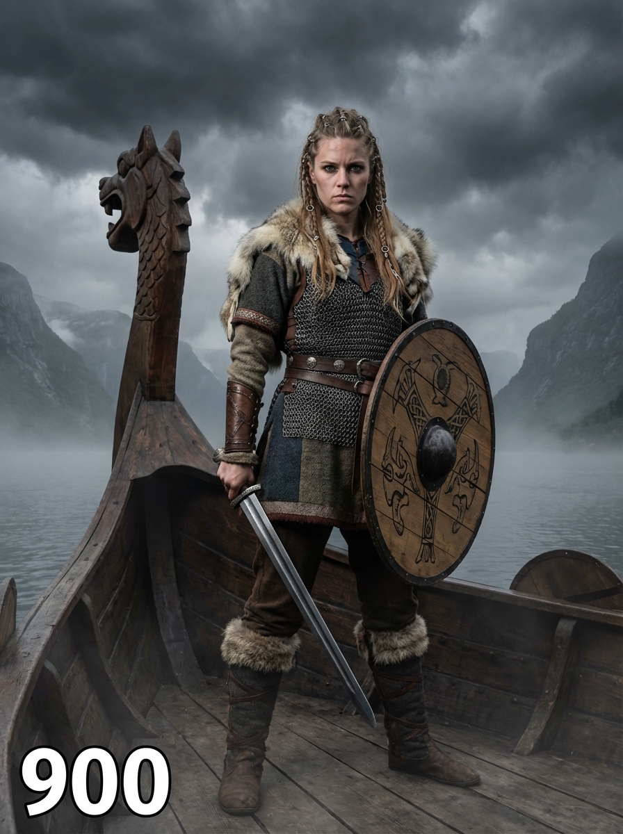 model as a fierce Viking shieldmaiden with intricate braided hair adorned with metal rings and beads, wearing layered wool and leather garments with fur trim, chainmail vest, and leather bracers standing on the deck of a longship with carved dragon head, surrounded by misty fjords and dramatic Nordic landscape under stormy skies, holding traditional weapons and wooden shield with Norse symbols, text overlay in bottom corner reading "900" in white sans serif font with black outline
