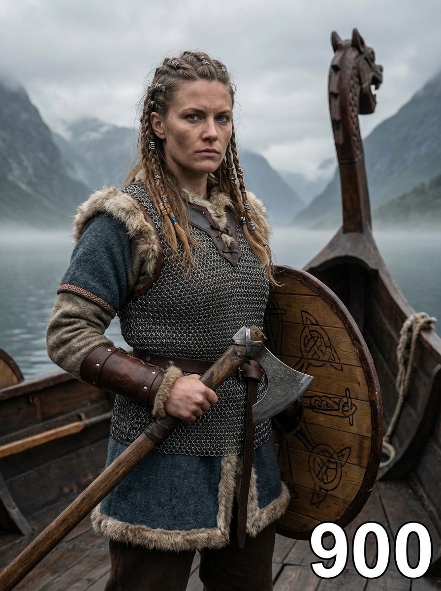 model as a fierce Viking shieldmaiden with intricate braided hair adorned with metal rings and beads, wearing layered wool and leather garments with fur trim, chainmail vest, and leather bracers standing on the deck of a longship with carved dragon head, surrounded by misty fjords and dramatic Nordic landscape under stormy skies, holding traditional weapons and wooden shield with Norse symbols, text overlay in bottom corner reading "900" in white sans serif font with black outline