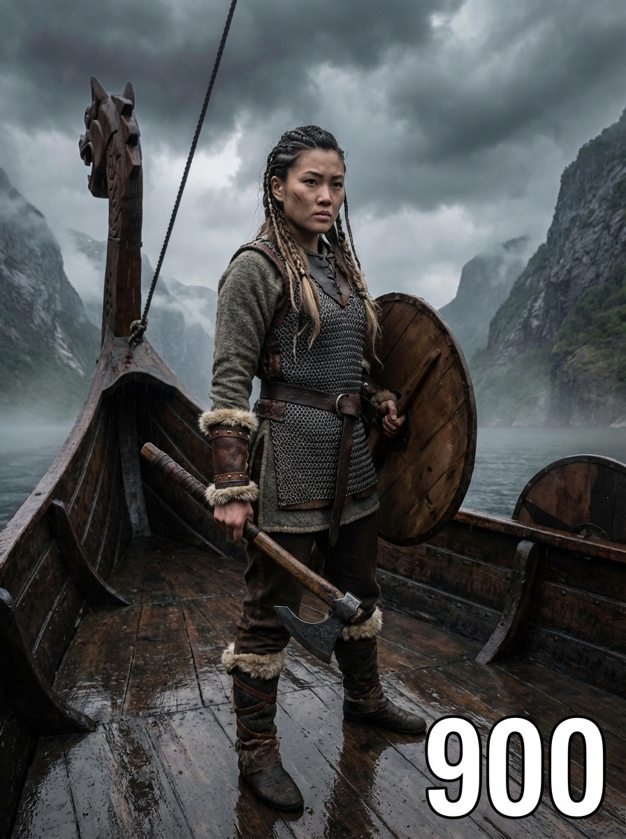 model as a fierce Viking shieldmaiden with intricate braided hair adorned with metal rings and beads, wearing layered wool and leather garments with fur trim, chainmail vest, and leather bracers standing on the deck of a longship with carved dragon head, surrounded by misty fjords and dramatic Nordic landscape under stormy skies, holding traditional weapons and wooden shield with Norse symbols, text overlay in bottom corner reading "900" in white sans serif font with black outline