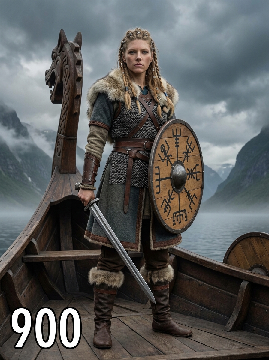 model as a fierce Viking shieldmaiden with intricate braided hair adorned with metal rings and beads, wearing layered wool and leather garments with fur trim, chainmail vest, and leather bracers standing on the deck of a longship with carved dragon head, surrounded by misty fjords and dramatic Nordic landscape under stormy skies, holding traditional weapons and wooden shield with Norse symbols, text overlay in bottom corner reading "900" in white sans serif font with black outline