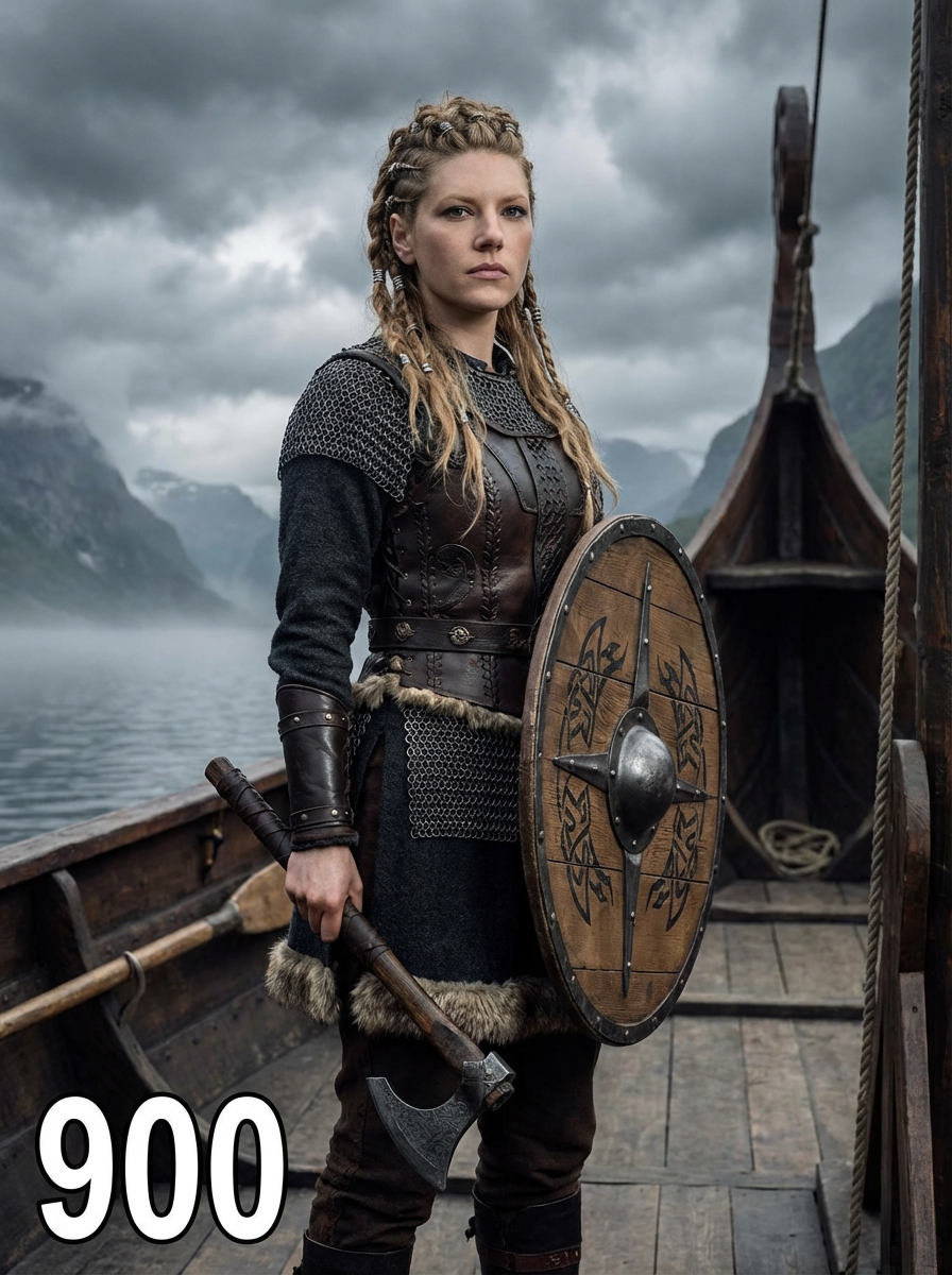 model as a fierce Viking shieldmaiden with intricate braided hair adorned with metal rings and beads, wearing layered wool and leather garments with fur trim, chainmail vest, and leather bracers standing on the deck of a longship with carved dragon head, surrounded by misty fjords and dramatic Nordic landscape under stormy skies, holding traditional weapons and wooden shield with Norse symbols, text overlay in bottom corner reading "900" in white sans serif font with black outline
