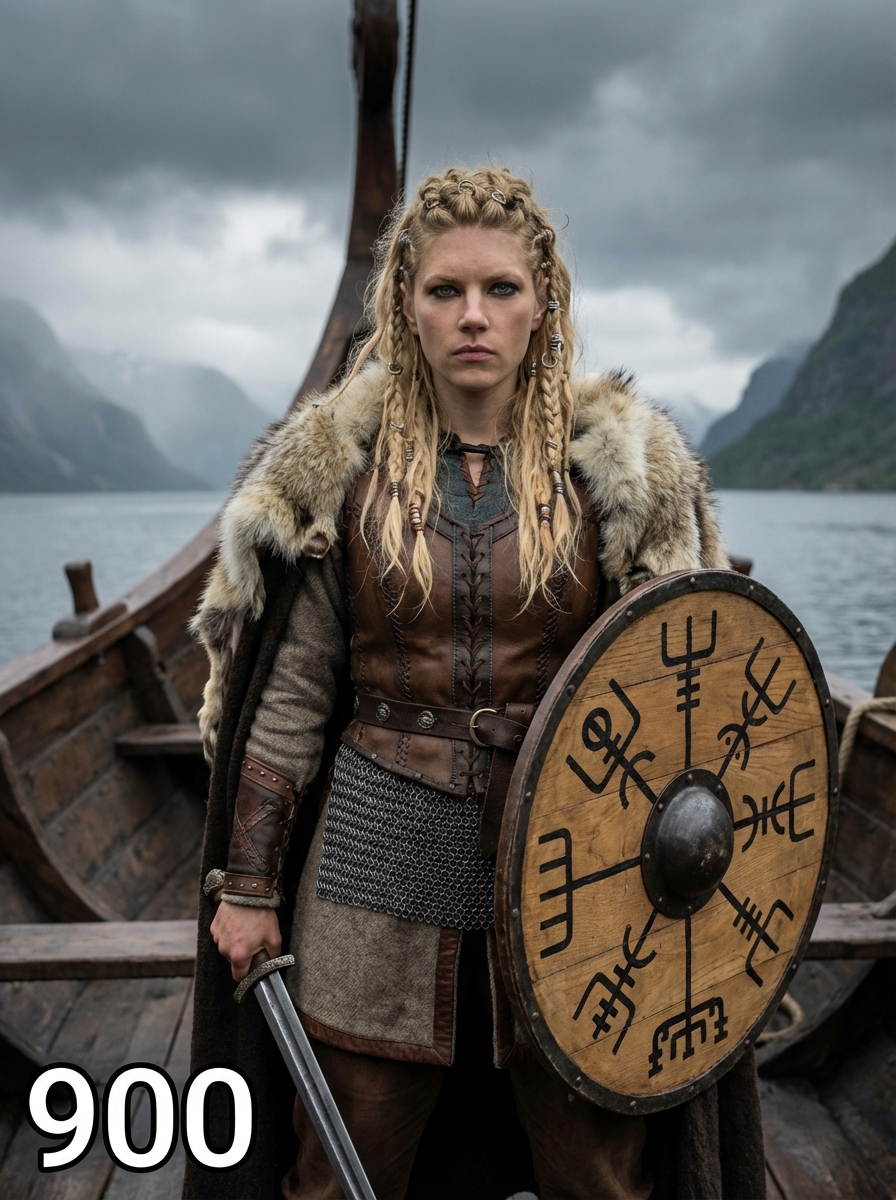 model as a fierce Viking shieldmaiden with intricate braided hair adorned with metal rings and beads, wearing layered wool and leather garments with fur trim, chainmail vest, and leather bracers standing on the deck of a longship with carved dragon head, surrounded by misty fjords and dramatic Nordic landscape under stormy skies, holding traditional weapons and wooden shield with Norse symbols, text overlay in bottom corner reading "900" in white sans serif font with black outline