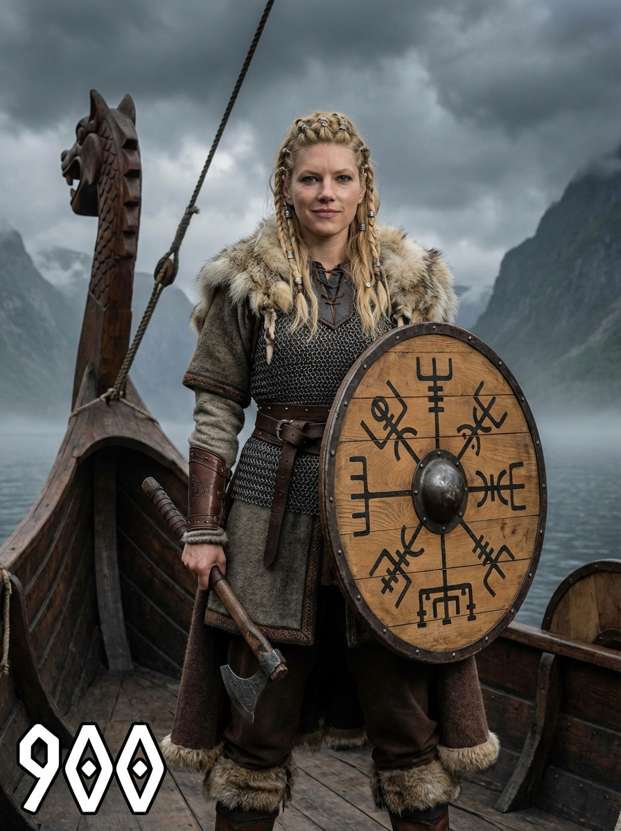 model as a fierce Viking shieldmaiden with intricate braided hair adorned with metal rings and beads, wearing layered wool and leather garments with fur trim, chainmail vest, and leather bracers standing on the deck of a longship with carved dragon head, surrounded by misty fjords and dramatic Nordic landscape under stormy skies, holding traditional weapons and wooden shield with Norse symbols, text overlay in bottom corner reading "900" in white sans serif font with black outline