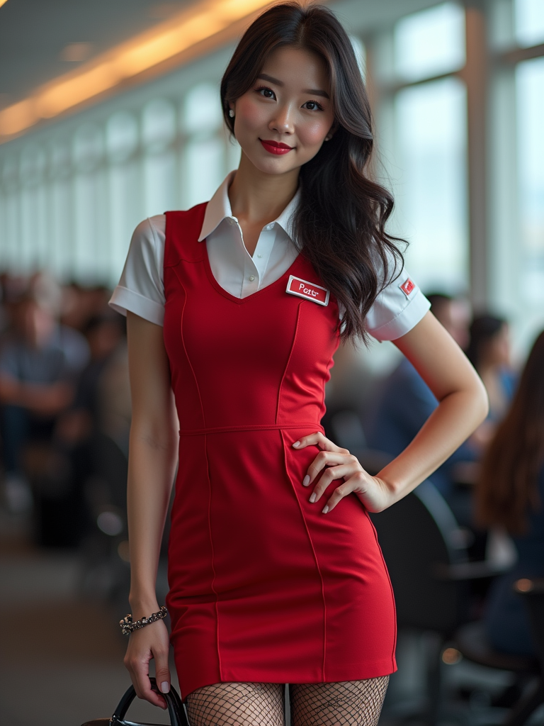 model as a flight attendant at airport briefing room, wearing a body-hugging flight attendant uniform with name badge, fishnet stockings and short skirt , preparing for flight with colleagues
