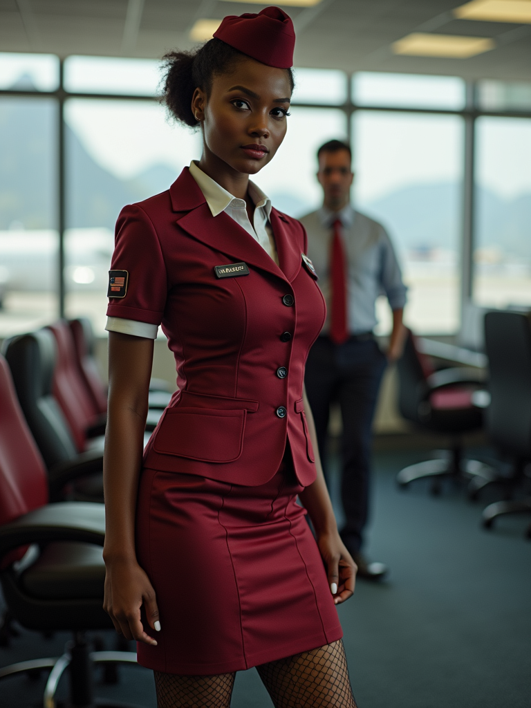 model as a flight attendant at airport briefing room, wearing a body-hugging flight attendant uniform with name badge, fishnet stockings and short skirt , preparing for flight with colleagues
