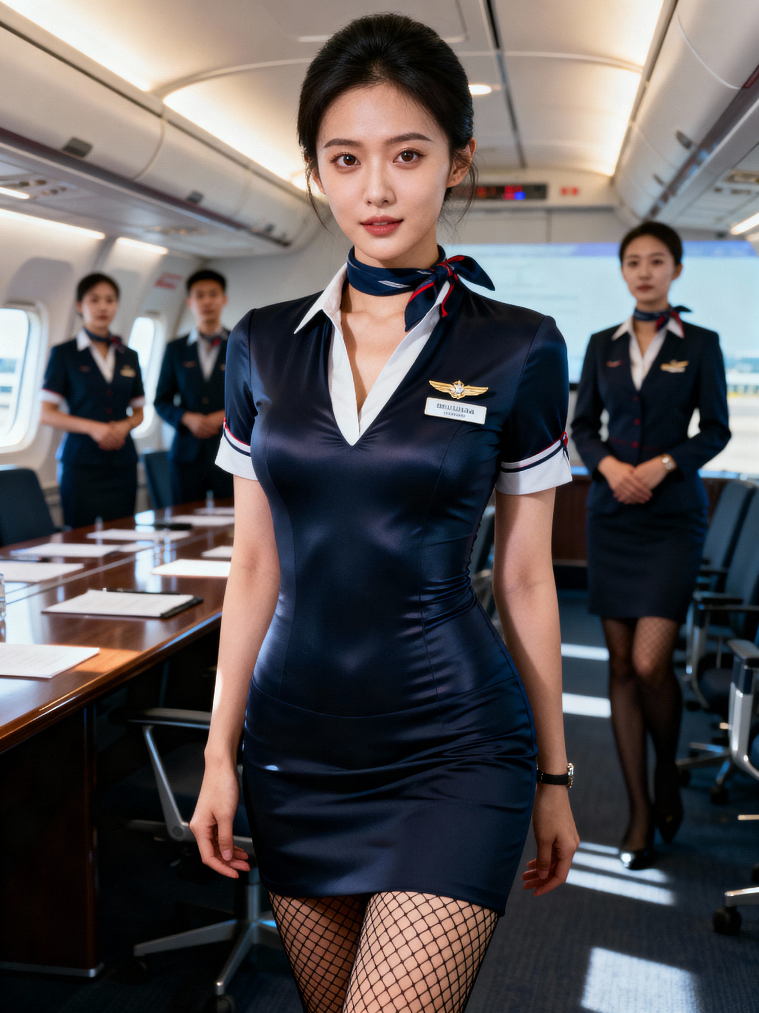 model as a flight attendant at airport briefing room, wearing a body-hugging flight attendant uniform with name badge, fishnet stockings and short skirt , preparing for flight with colleagues